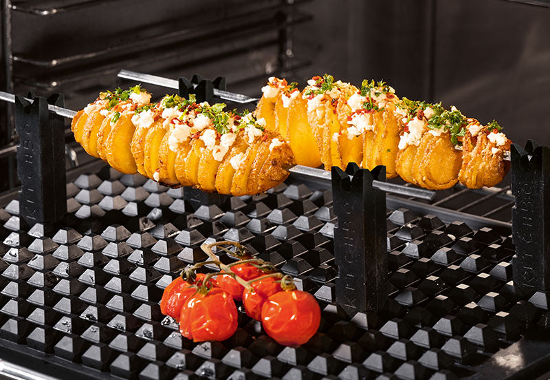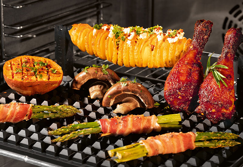 Durch die 280 Pyramidennoppen liegen die Lebensmittel während des Garens nicht mit voller Fläche, sondern nur punktuell auf und werden so von allen Seiten knusprig.