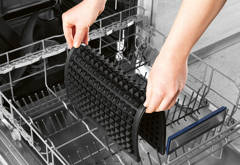 Die speziellen Ränder des KitchBo Schwamms passen genau in die Vertiefungen der Backmatte und entfernen zielgerichtet Speisereste und Fett.